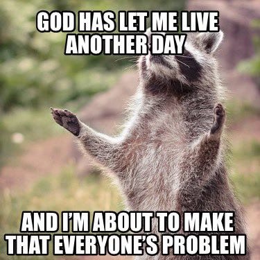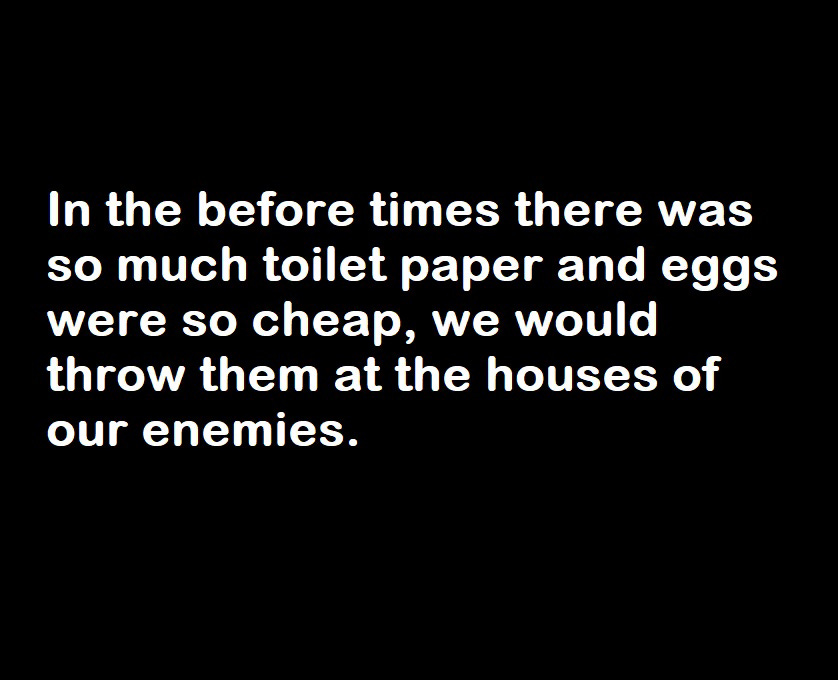 Thanks for sharing…i needed the laughs..I especially liked the raccoon…we now have a trap to catch and release at least five miles away. But my very favorite was the eggs and TP…so true. Be blessed today.